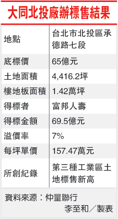 大同昨(23)日標售北投廠土地,僅富邦人壽一家投標,以69.54億元標下,溢價率僅7%,未見買家高價競逐,凸顯商辦市場氣氛也轉趨冷清。惟房仲業者分析,以歷年台北市第三種工業土地來看,南僑台北舊廠儘管降價求售,每坪也只有89萬元,大同同樣為工三土地,每坪157萬元,已創下該種土地全台新高紀錄。 房產業界人士說,今年下半年房市大幅降溫,但商辦市場價量齊揚,被視為不動產的支撐要角,但從此次標案結果來看,商辦市場熱度也下降,但仍優於住宅市場需求。得標的富邦人壽初步規劃繼續出租,租金投資報酬率約2%,未來伺機辦理都市更新重建,屆時投資報酬率可達3%。據統計,富邦人壽今年來大舉出手買進不動產,至少買進逾141億元,成為今年壽險業「最大購地王」。