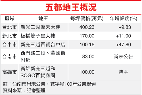台北市地政處昨(14)日公布民國101年北市公告土地現值評定結果,全市公告現值平均漲幅9.87%,漲勢略低於今年。新光摩天大樓連續第14年蟬聯全台地王,台北101大樓則緊追在後。另外五都101年的公告現值,目前僅剩下台南市尚未公告,從地王的漲幅看,台中市地王「新光三越台中店」最夠力,漲幅超過40%;全台「地王」,則是昨日公告的台北市「新光摩天大樓」稱霸,每坪高達400.23萬元。房產人士說,如果從全國各區域觀察,北部地區土地價格已經達到高點,加上政府打炒房,增幅趨緩;南部區域則是相當平穩。至於中部地區的台中,基期低,加上這幾年發展快速,土地價值增幅驚人。