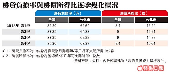 央行引內政部資料表示,去年第4季全國房貸負擔率35.36%,台北市為63.37%;全國房價所得比8.4倍,台北市15倍。央行總裁彭淮南曾表示「房價所得比5倍比較正常」,央行官員昨日再次強調,「全台的房價都偏貴」。