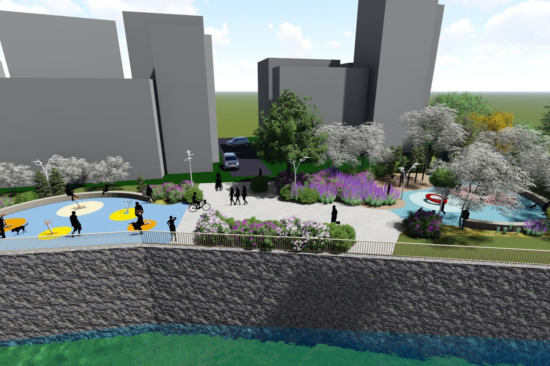 本案將瓦磘溝沿岸綠地設為小型公園,運用水的意象融合地景設計,以在地特色凸顯本區發展主題。步道採用曲折路徑設計,配合休憩設施,提供民眾舒適安全的漫步空間。