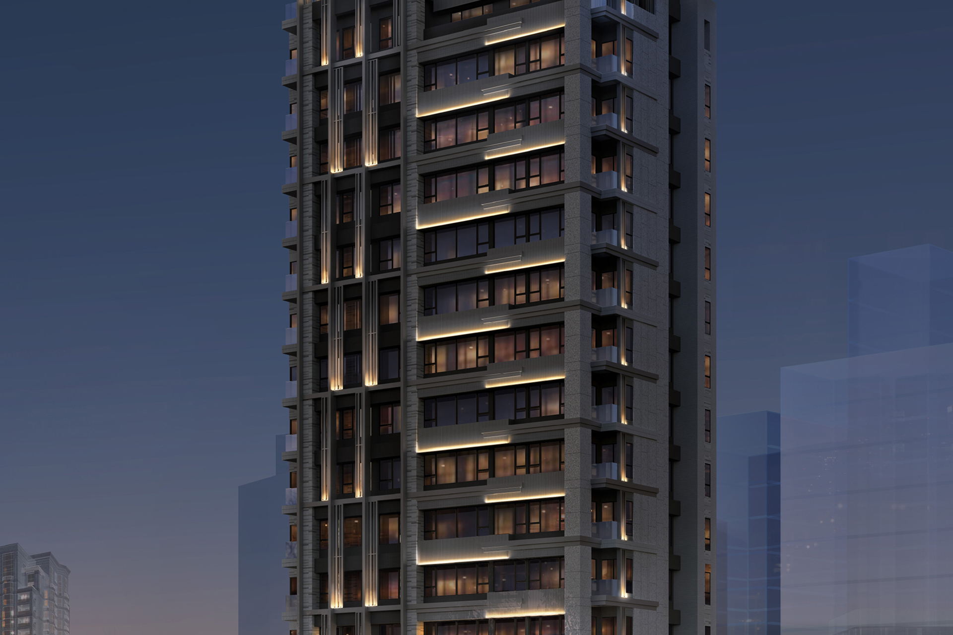 本案位於臺北市士林區,以靜巷深蘊、城市隱境為設計理念,立面以垂直格柵與水平框架錯落構築,灰白色調搭配深色窗框展現沉穩優雅;夜間以線性暖光勾勒量體,體現出靜謐的建築詩意。