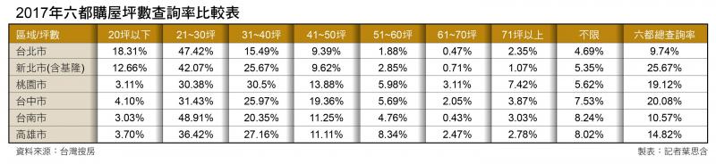 根據台灣搜房網藉由民眾網路覓屋搜尋條件,統計出六都購屋坪數查詢率,分析各縣市準買家理想中的購屋主流坪數,發現台北市總價1000~2000萬元最多購屋族搜尋,新北市則以800~1000萬為主,至於桃園以南皆以500~800萬元居冠。坪數部分,全台皆以21~30坪最受歡迎,尤其雙北市過半皆想買30坪以下的小宅,而中南部也有越買越小的趨勢,50坪以上住宅需求僅約1成左右。