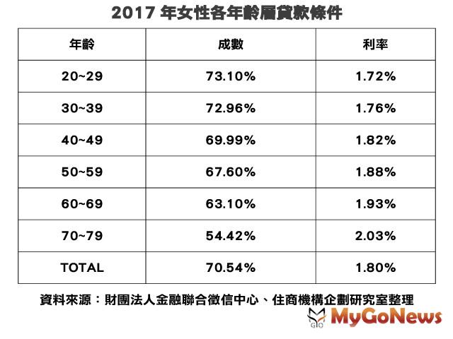 住商機構企劃研究室依據金融聯徵中心資料,統計2017年各年齡層女性的貸款條件,全體平均貸款成數七成、貸款利率1.80%,貸款條件最好的年齡層是20~29歲,貸款成數73.10%、利率1.72%,隨著年齡層越來越高,成數愈來越低、利率越來越高,年齡邁入4字頭,貸款成數不到七成,利率方面,除70歲以上利率達2%之外,其餘皆低於2%。