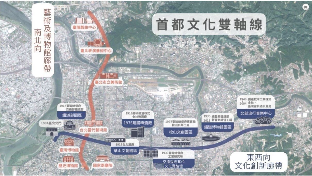 文化部表示,去年中即已提出,由「東西向文化創新廊帶」與「南北向藝術及博物館廊帶」構成的首都文化雙軸線計畫,期盼讓首都臺北能不僅是政治中心、經濟中心,更是文化中心。