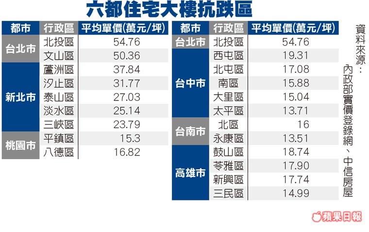 近期房市因武漢肺炎疫情進入冷卻期,市場更憂心房價重演SARS時期大跌狀況,不過業者根據去年六都房價表現列出相對抗跌區,發現北部多集中在外圍區,中南部則多位市中心。專家分析,抗跌區因受市場影響較低,利空波動反應不顯著,適合追求不動產穩定的購屋族。中信房屋根據去年六都實價資料,統計住宅大樓房價相對穩定的行政區,台北市為文山區、北投區,皆屬距核心市中心較遠地帶,大樓房價每坪5字頭;新北市以汐止、三峽、泰山、蘆洲及淡水等區較抗跌,其中汐止和蘆洲比鄰北市,單價站上3字頭,其餘區域因離市中心遠,單價僅2字頭。大家房屋企研室主任郎美囡表示,通常價格較穩區的特色是生活機能佳、房型貼近買方需求,格局多為2∼3房,坪數落在40坪以下,交易量有一定買盤支撐,導致房價不會起起伏伏,以新北市來看,價穩區平均房價低,尤其汐止就業、就學人口與台北市內湖、南港生活區重疊,房價又較低,因此吸引民眾進駐。